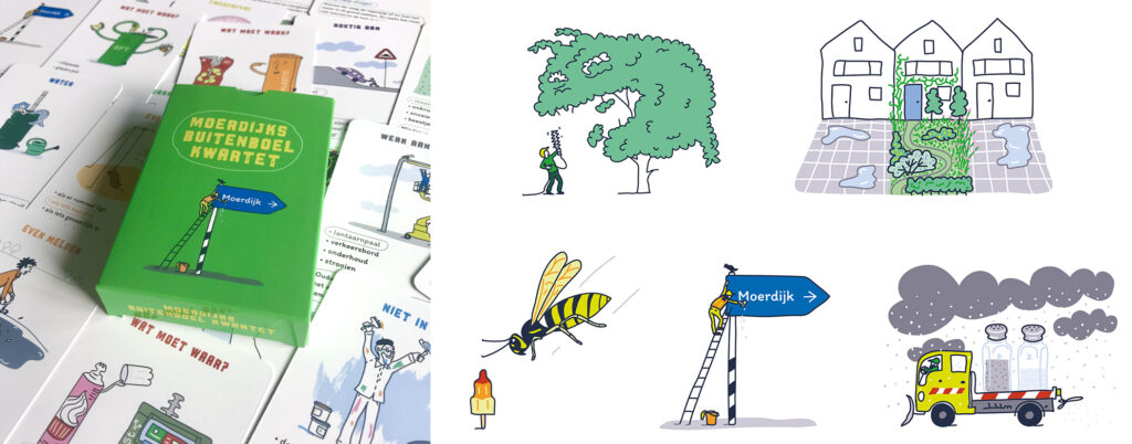 In samenwerking met de afdeling communicatie maakte ik Moerdijks Buitenboel Kwartet. Ze bedachten 13 kwartetten met als onderwerp de openbare ruimte. Ik verzon er 52 illustraties bij, maakte een speels kaartontwerp, een strak dessin/patroon voor de achterzijde én natuurlijk het uitnodigende doosje voor dit spel. Een intensieve klus en vlotte samenwerking waarbij we elkaar over en weer inspireerden met één gezamenlijk doel: een fris en vrolijk kwartet voor alle leeftijden maken. Op 4 oktober werden de kwartetten uitgedeeld op de open dag van het gemeentehuis in Zevenbergen. Informatief met veel woord- en beeldgrapjes!